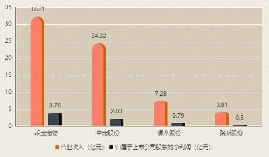 伴随着半年报收官,“宠食F4”的业绩已经揭晓。整体来看,今年上半年,乖宝宠物的营业收入和归属于上市公司股东的净利润均排首位,中宠股份紧随其后,而佩蒂股份营收净利同比双降,体量最小的路斯股份增收不增利。